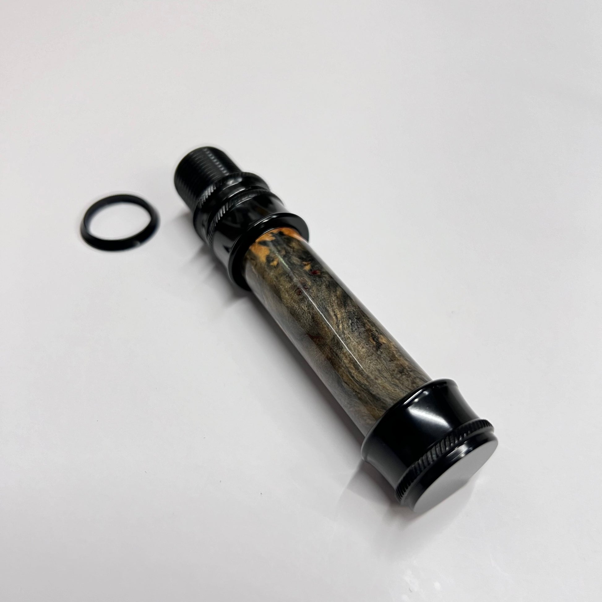 Beautiful Avante Studio Parts reel seat made of aluminum in downlock variation including a custom insert made of dyed and polished burl wood.