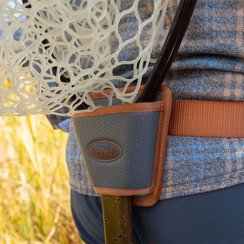 The Fishpond landing net holder is based on the principle of keeping your landing net secure and out of the way, yet still within easy reach at all times. There are several ways to attach the landing net holder. The first option is to attach it to your belt (recommended width: approximately 3.8 cm), by simply pulling the holder over the belt. The second option is the lockable flap (with snap fastener), which can also be attached to a wading belt, but also to various Fishpond slings, hip packs, or backpacks.