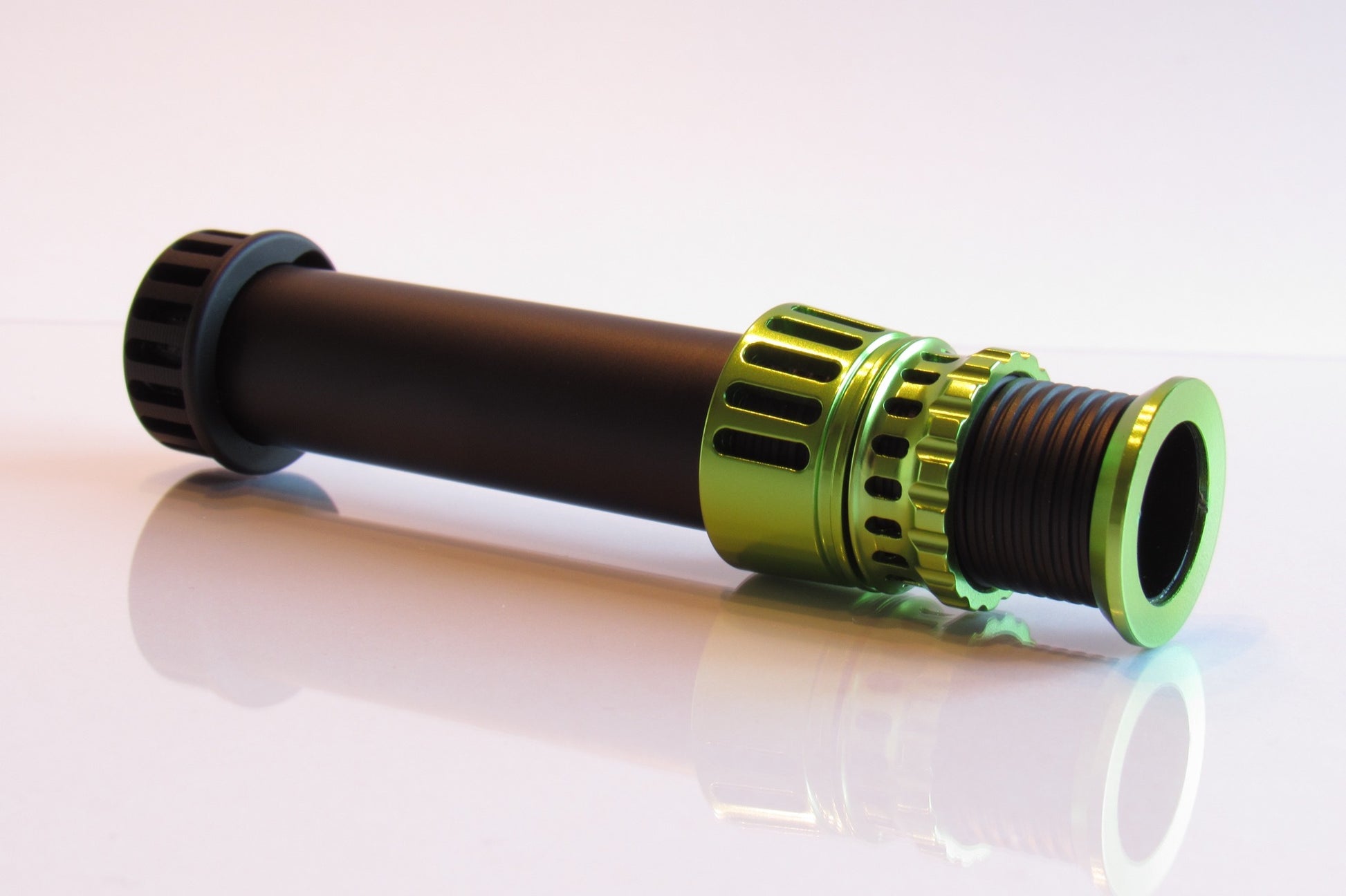 Exclusive uplock reel seat made of aluminum in matt black with olive green hardware and connecting ring