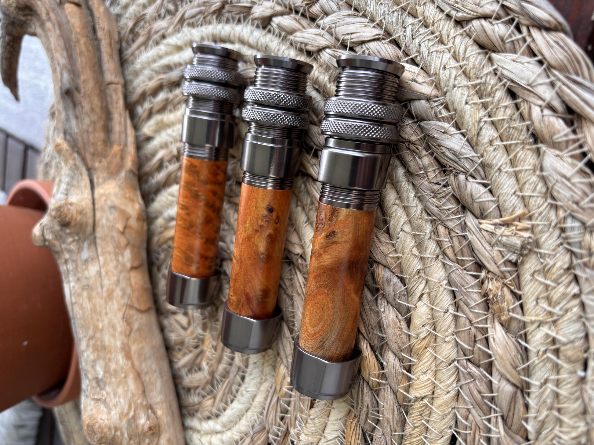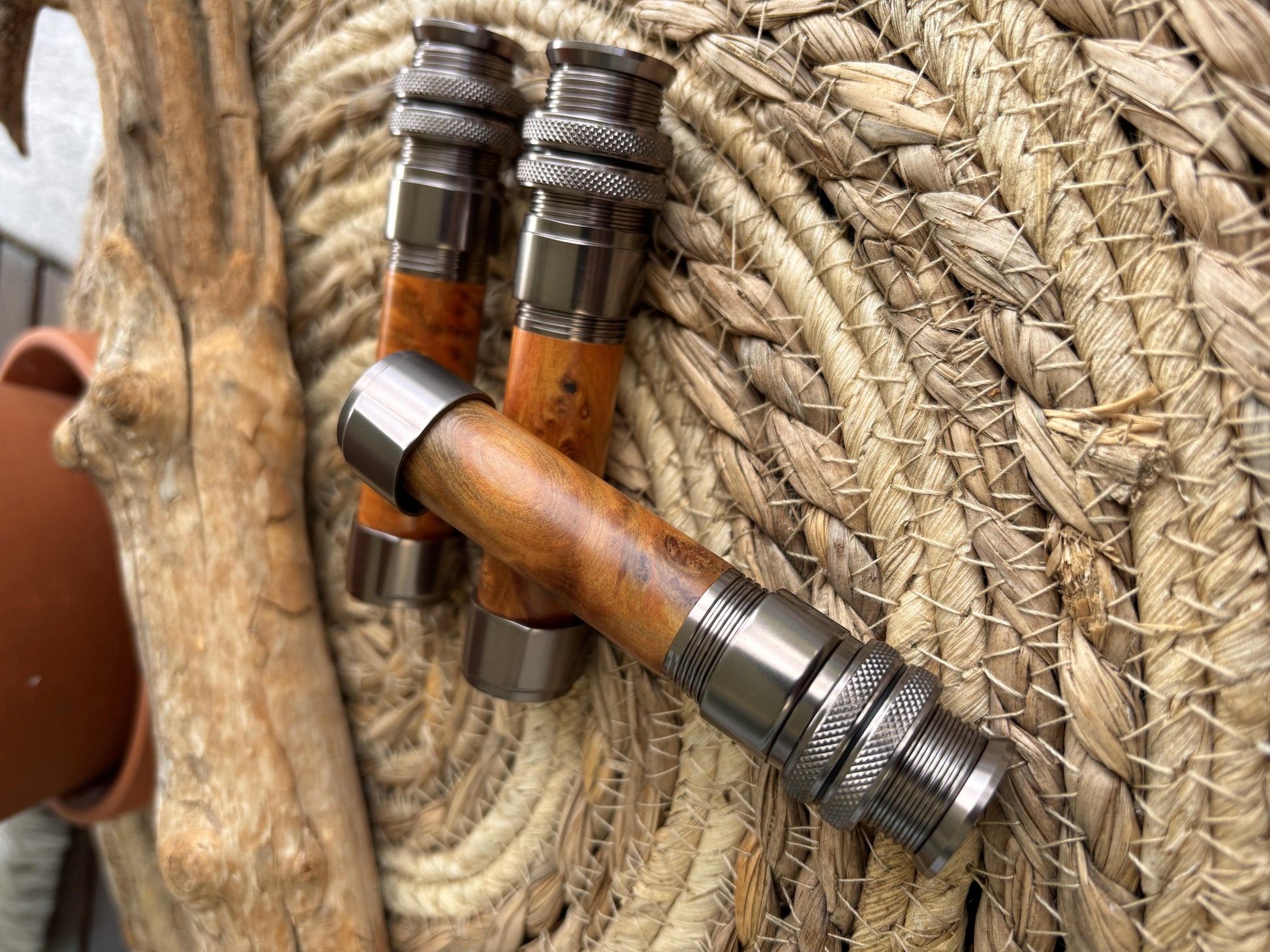 Porte-moulinet downlock très élégant pour cannes de classe 3-5 avec entretoise en bois précieux et anneau de connexion de couleur gunsmoke. Les bagues en nickel noir Snakebrand vont parfaitement avec cela.