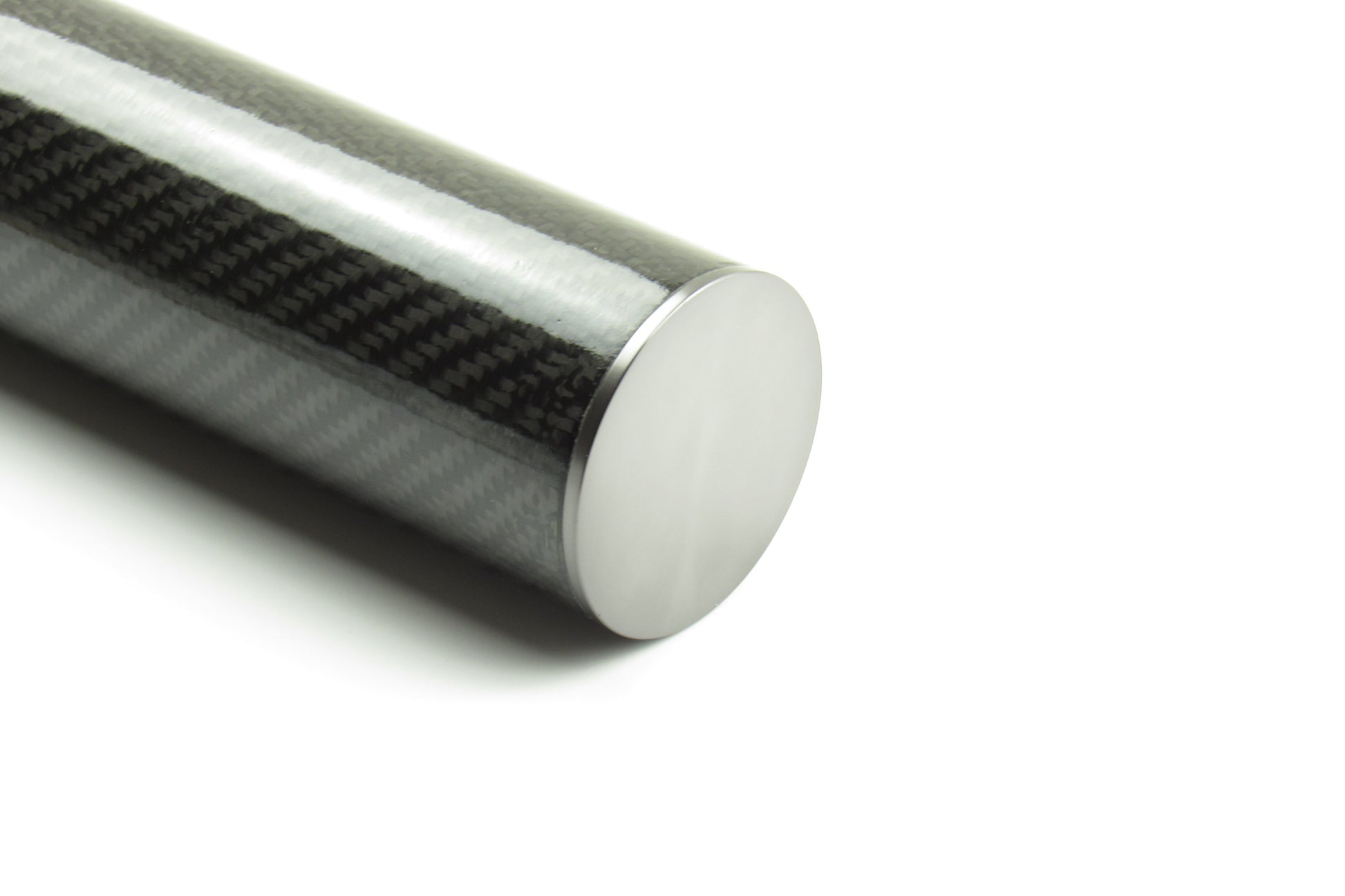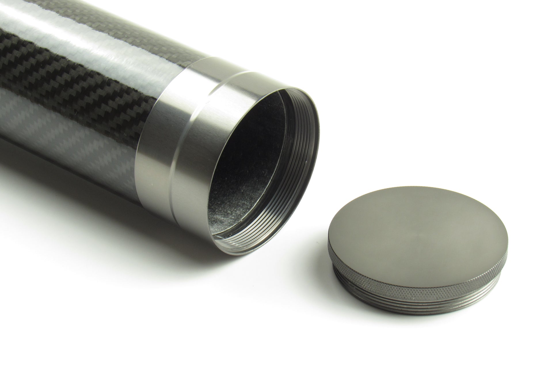 Tube de tige en carbone avec base et couvercle en aluminium couleur gunsmoke. Très léger et robuste. Le diamètre est de 56 mm. Convient également aux cannes switch ou nymphing.