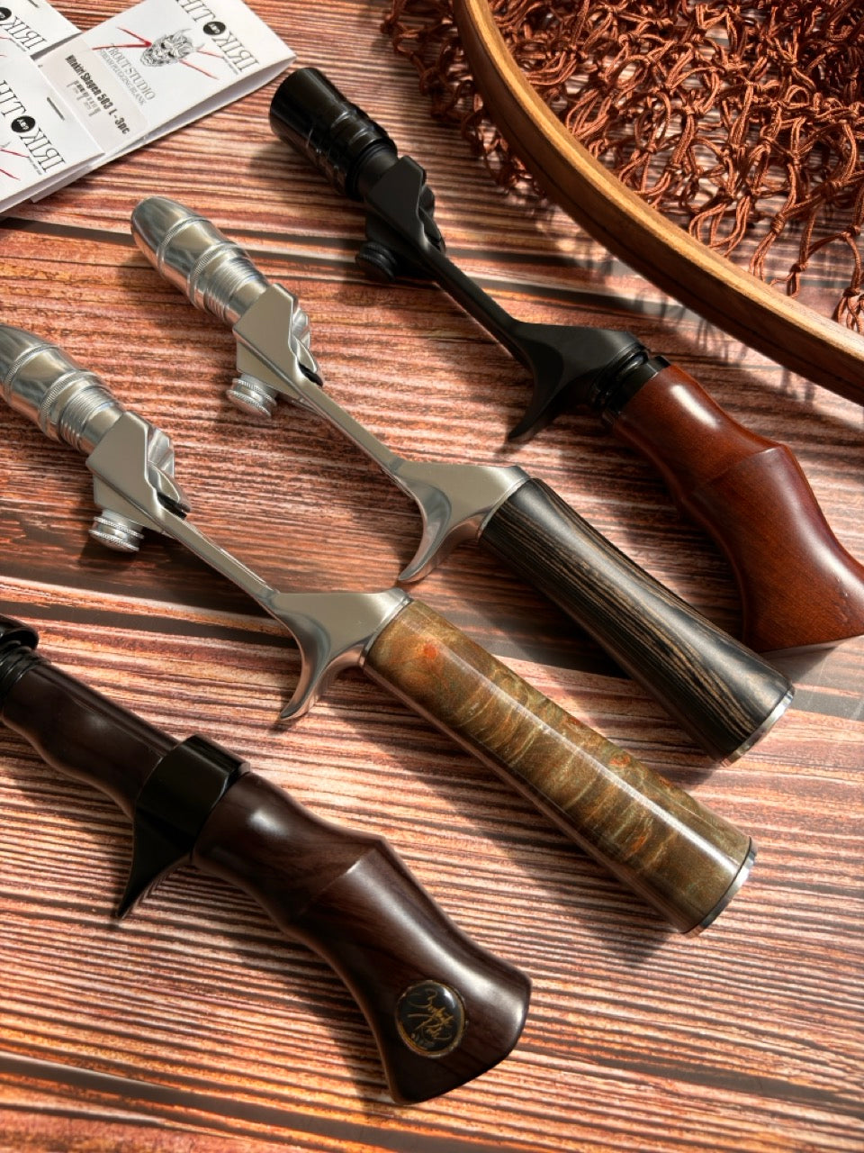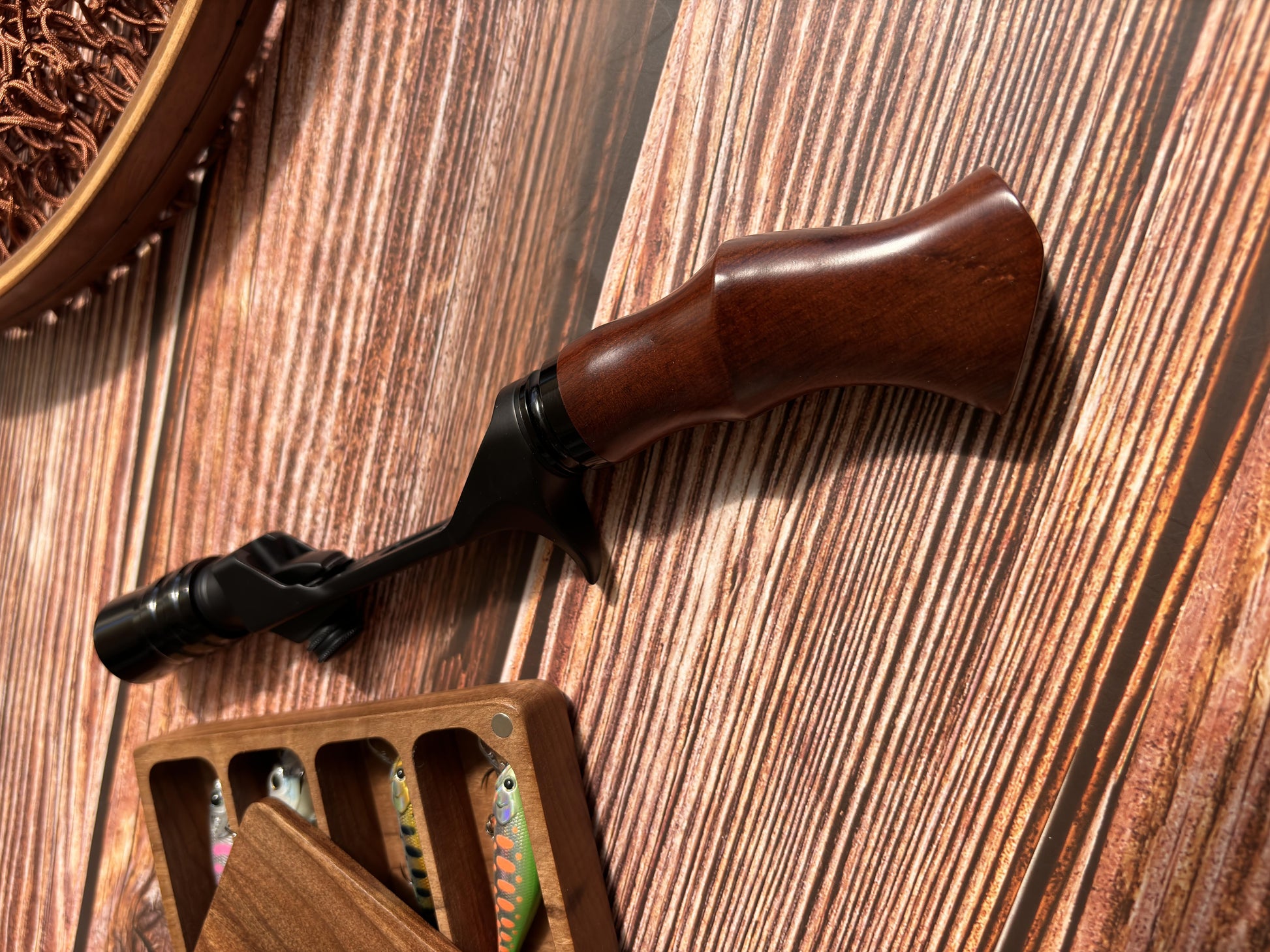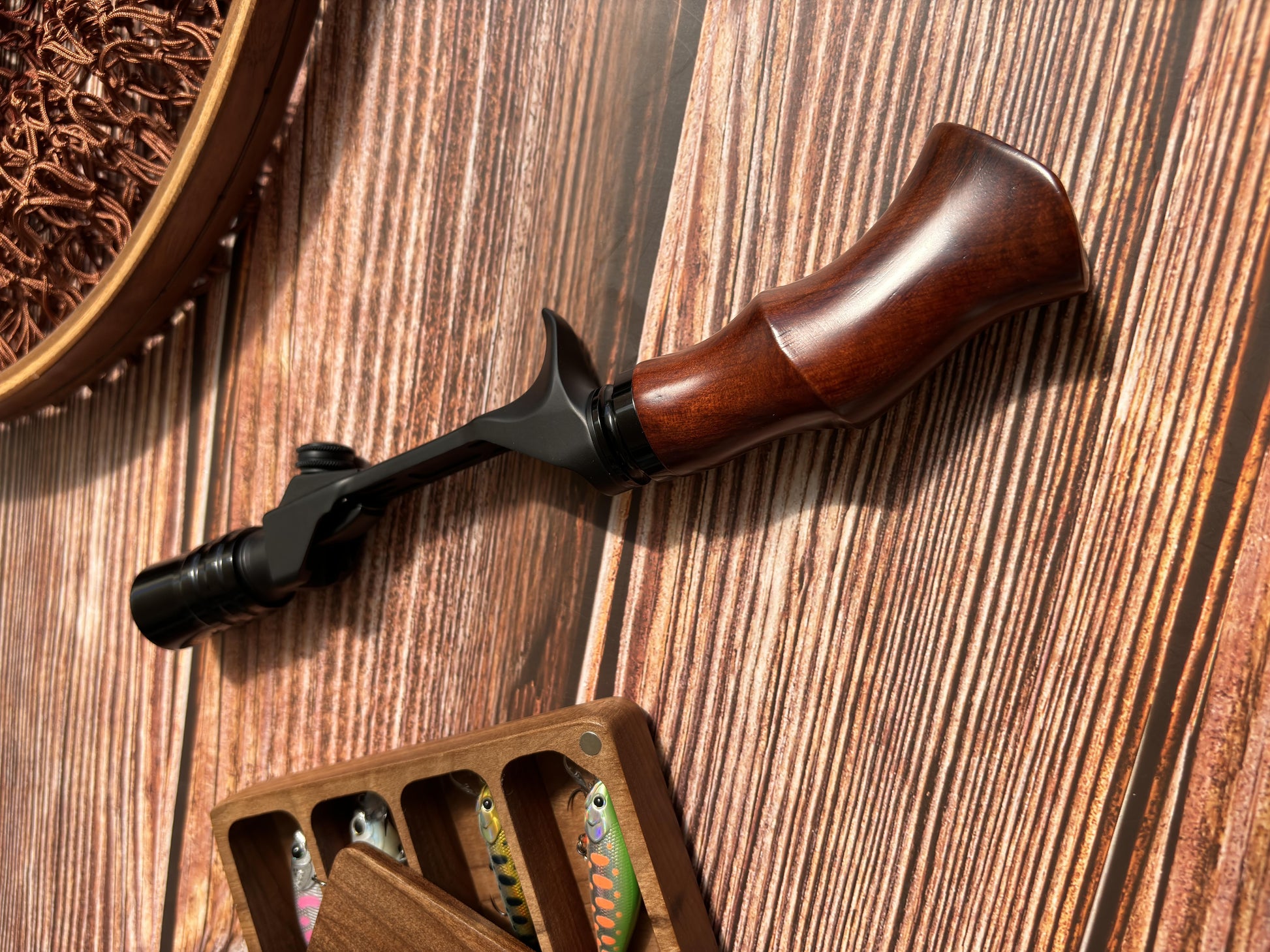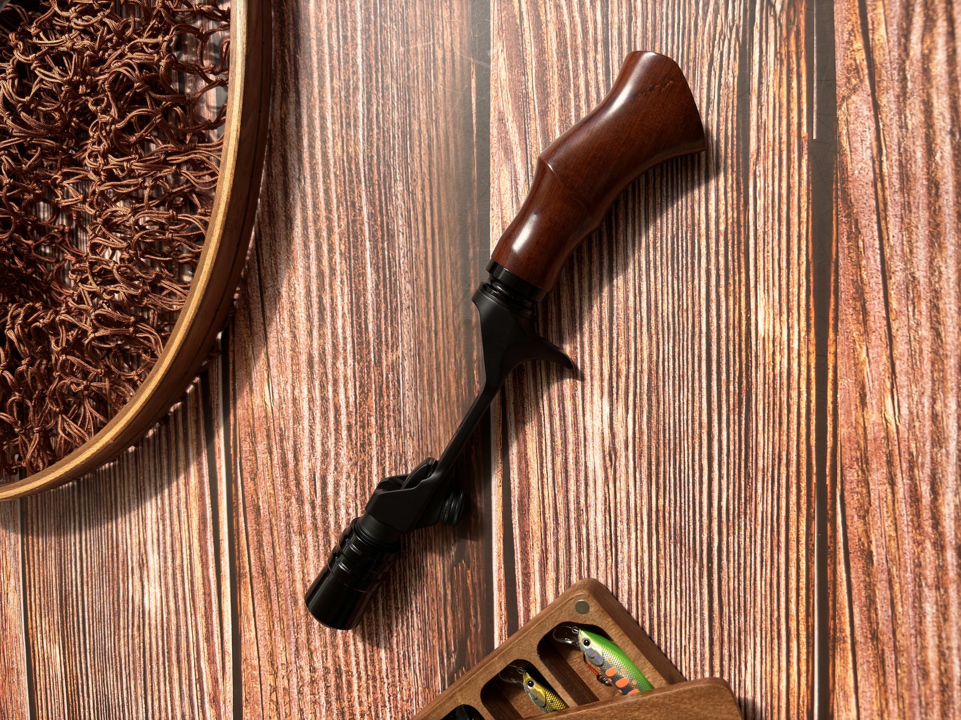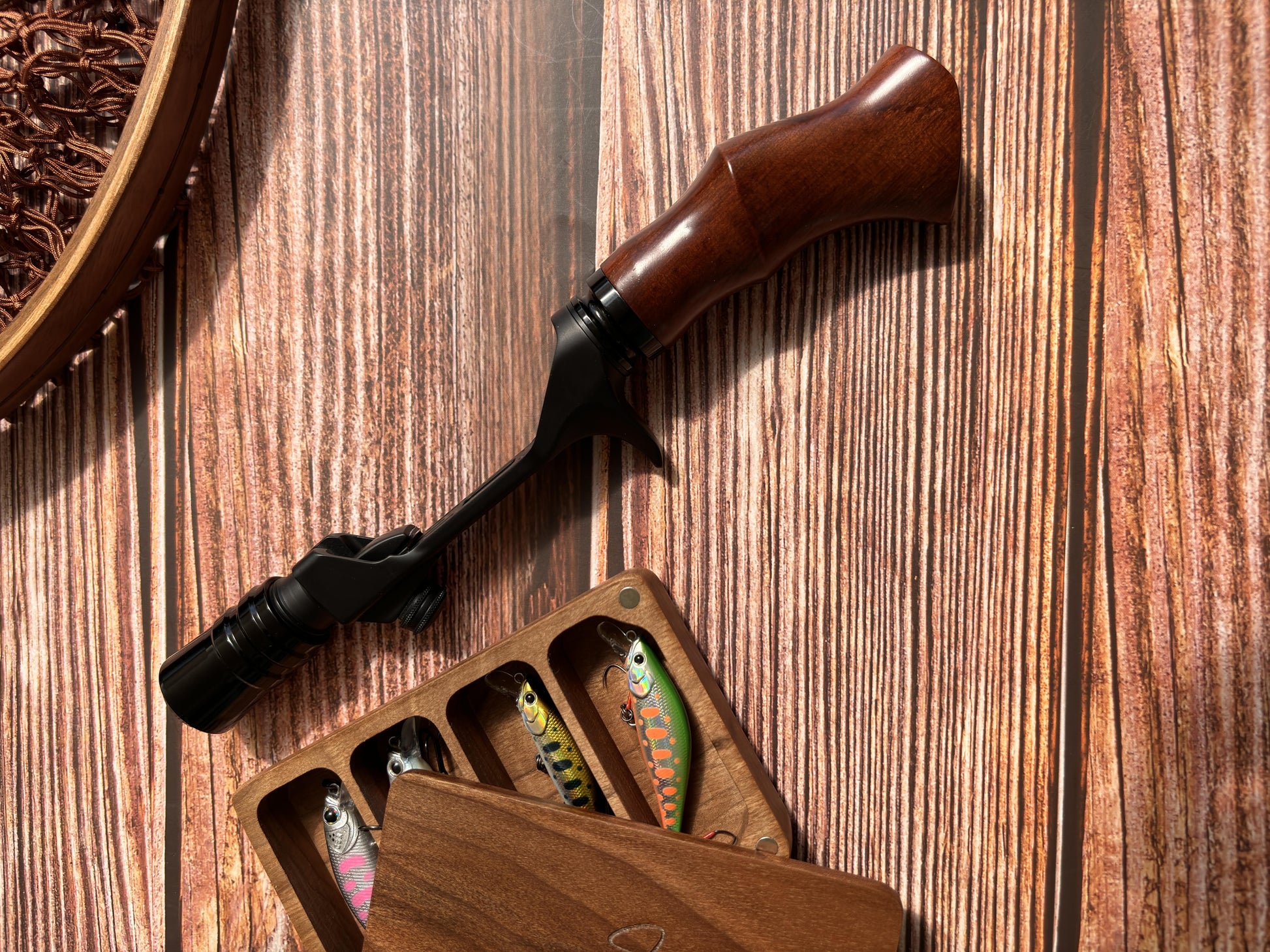 Poignée exclusive Soulmate Rods Sunken Reel Offset Grip en noir mat avec une poignée pistolet en bois de loupe stabilisé rouge-brun.