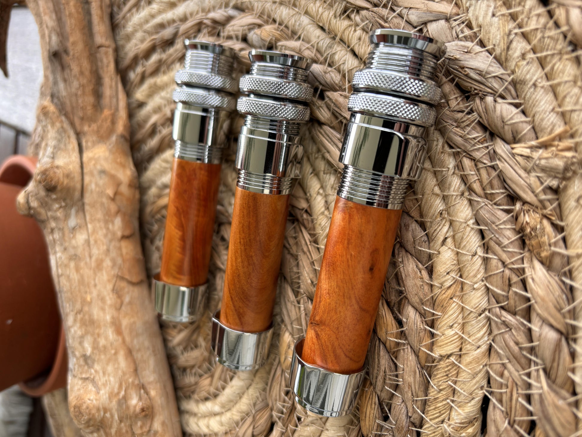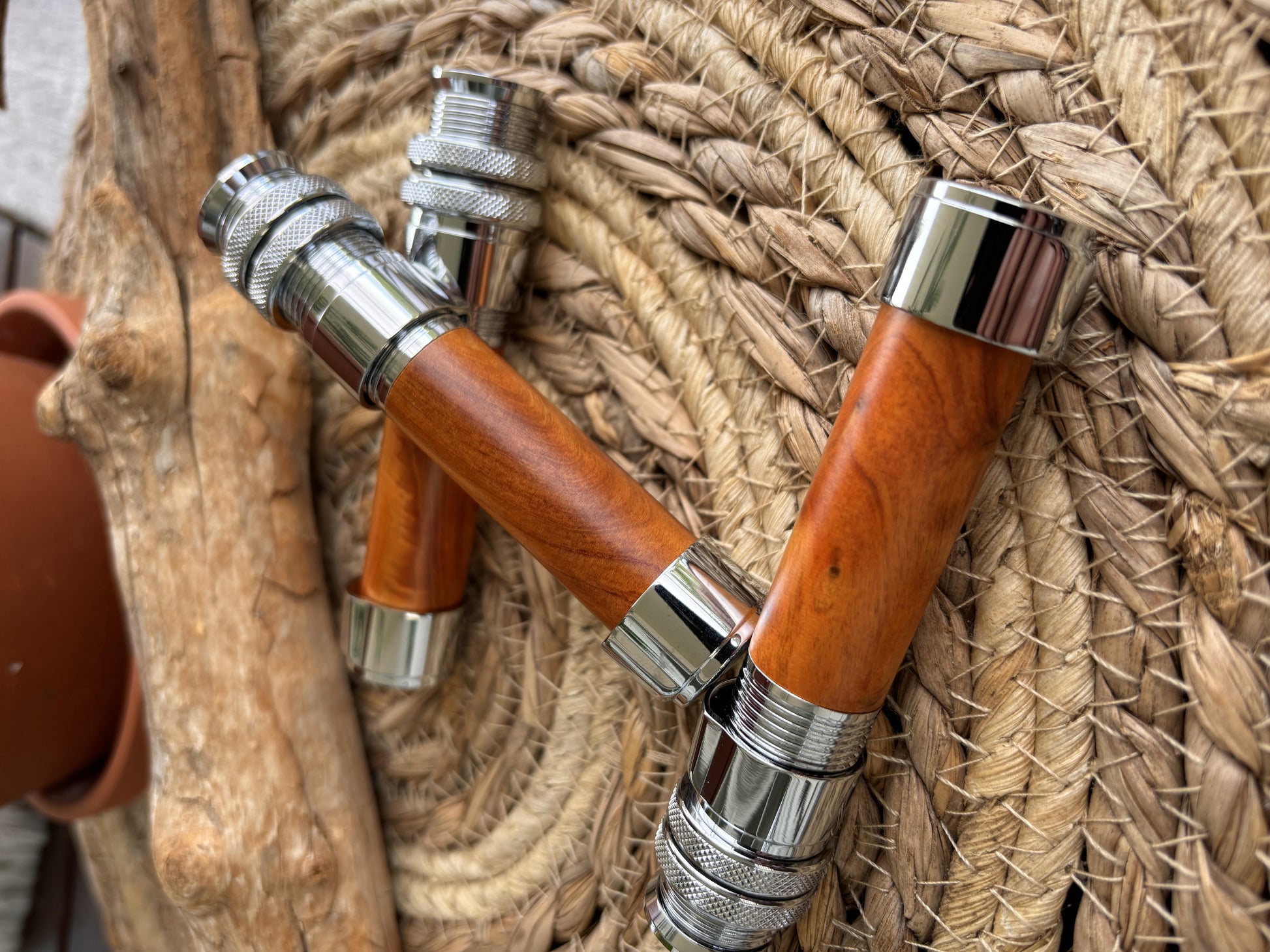 Sehr edler Downlock Rollenhalter für Ruten der Klasse 3-5 mit Edelholzspacer und Anschlussring in der Farbe chrome. Ideal passen dazu die Snakebrand chrome nickel Ringe.